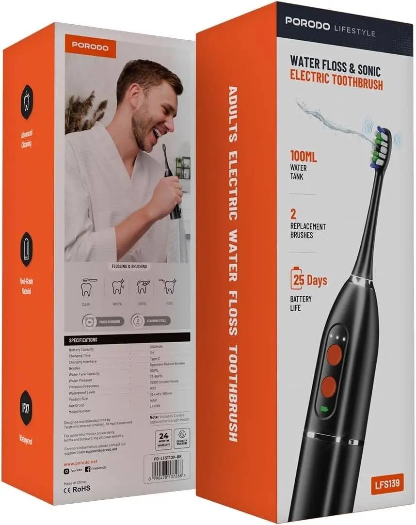 PORODO Lifestyle 1000mAh IPX7 Electric Toothbrush with Manual Mode 110ml Water Tank Type-C