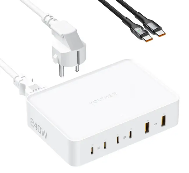 أطلق العنان لـ 240 واط من الطاقة الفائقة : مع منفذ USB-C واحد يوفر ما يصل إلى 140 واط والمنافذ الخمسة المتبقية تتقاسم ما يقرب من 100 واط، يمكنك شحن ما يصل إلى ستة أجهزة في وقت واحد بأقصى طاقة إخراجية تبلغ 240 واط